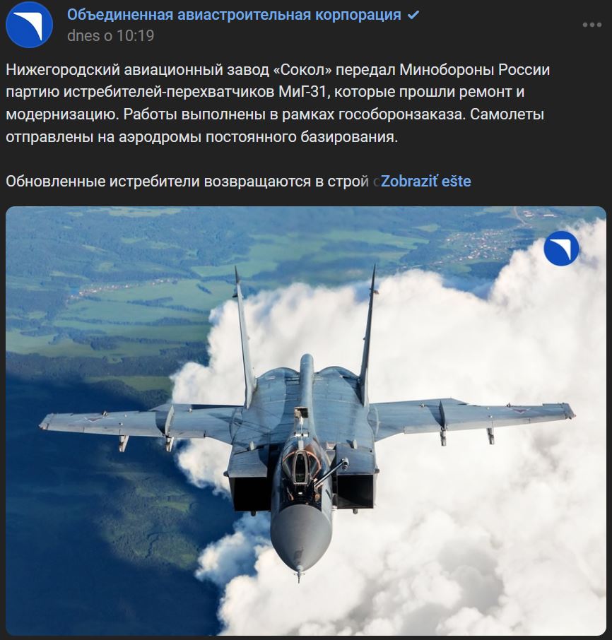 "Modernizácia lietadiel MiG-31 (МиГ-31) je jednou zo základných kompetencií a najdôležitejšou činnosťou leteckého závodu Sokol (Сокол) v meste Nižný Novgorod v korporáte OAK. Podnik si plní svoje záväzky pri zabezpečovaní potrebných lietadiel pre ruskú armádu. Práce budú pokračovať v rámci plnenia kontraktov na tento rok 2023," povedal generálny riaditeľ OAK Jurij Sljusar (Юрий Слюсарь)