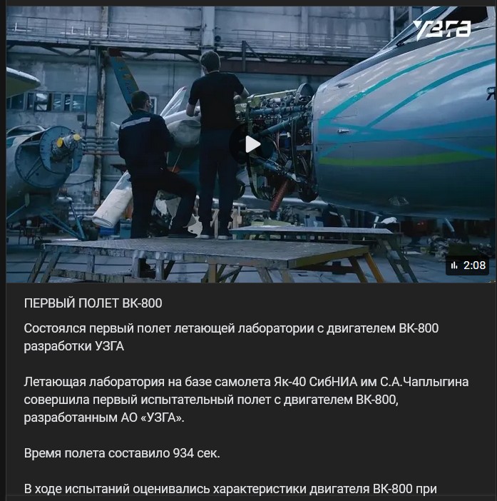 Uskutočnil sa prvý let lietajúceho laboratória s motorom VK-800 (ВК-800) vyvinutým spoločnosťou UZGA (УЗГА). Lietajúce laboratórium na základe lietadla Jakovlev Jak-40 (Як-40) spoločnosti SibNIA S.A.Čaplygina (СибНИА им С.А.Чаплыгина) uskutočnilo prvý skúšobný let s motorom VK-800 (ВК-800) vyvinutým spoločnosťou AO UZGA (АО «УЗГА»).