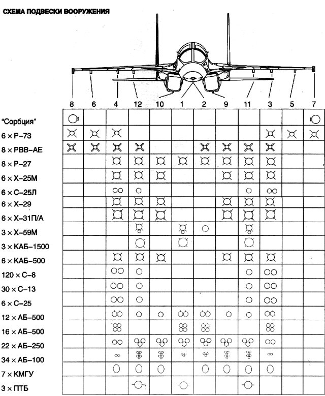 Staršia schéma možnej kombinácie výzbroje na Su-34 (na ktorý závesník akú zbraň možno / bolo možno podvesiť):