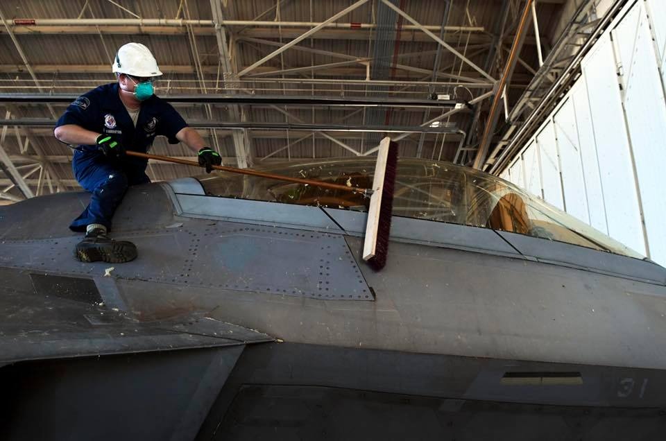 kde je Foto: Podľa neho ich stačí len očistiť a budú pripravené opäť lietať .. ale BOZP nadovšetko = technik pri zametaní lístia z "nebezpečného" povrchu F-22 musí mať rúško. Všimnite si koľko rukavíc má na opasku = na rôzne diely povrchu iný typ rukavíc ...