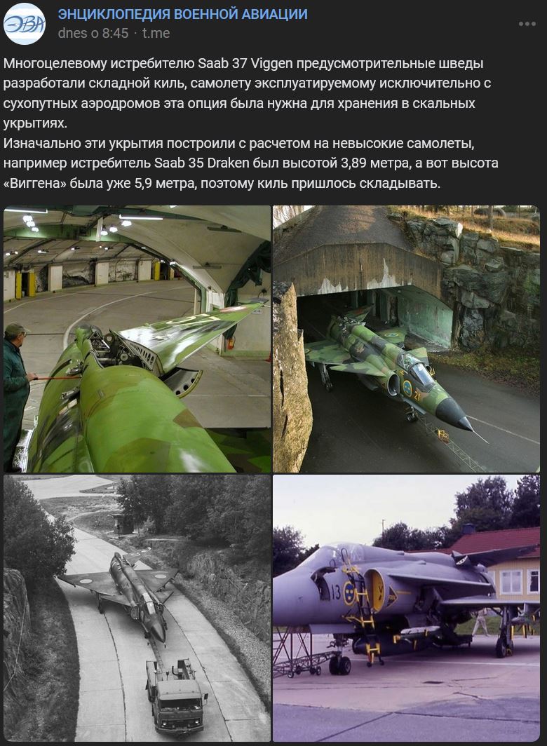 Pre viacúčelové stíhacie lietadlo Saab 37 Viggen vyvinuli obozretní Švédi skladací kýl (kormidlovka), lietadlo operovalo výlučne z pozemných letísk, táto možnosť bola potrebná pre skladovanie v skalných úkrytoch. Spočiatku sa tieto úkryty stavali s predpokladom nízkych lietadiel, napríklad lietadlo Saab 35 Draken bolo vysoké 3,89 metra, ale Viggen už mal výšku 5,9 metra, takže kýl musel byť sklopný.