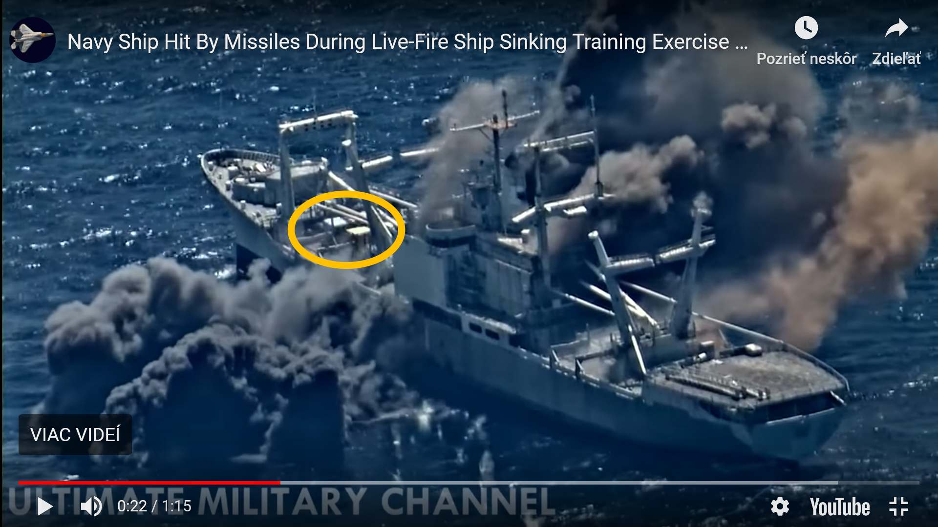 Edit: Ne! V 21s jde vidět přilétat další střelu z pozice 10-11h. V pořadí čtvrtá. Proto se zvedne ten plech a vylétnou střepiny na hladinu podél boku lodi.