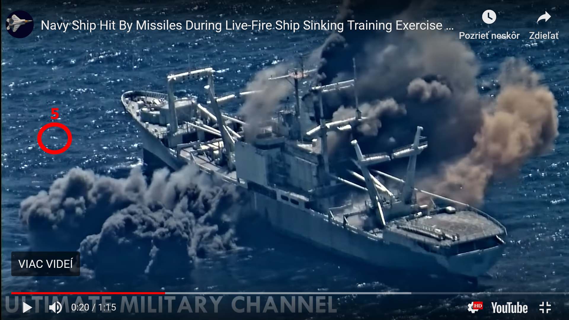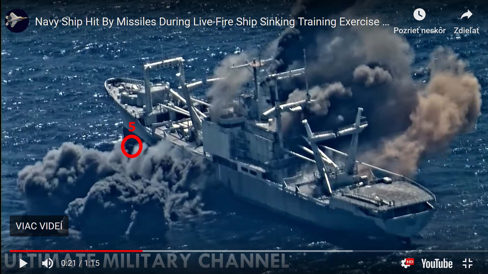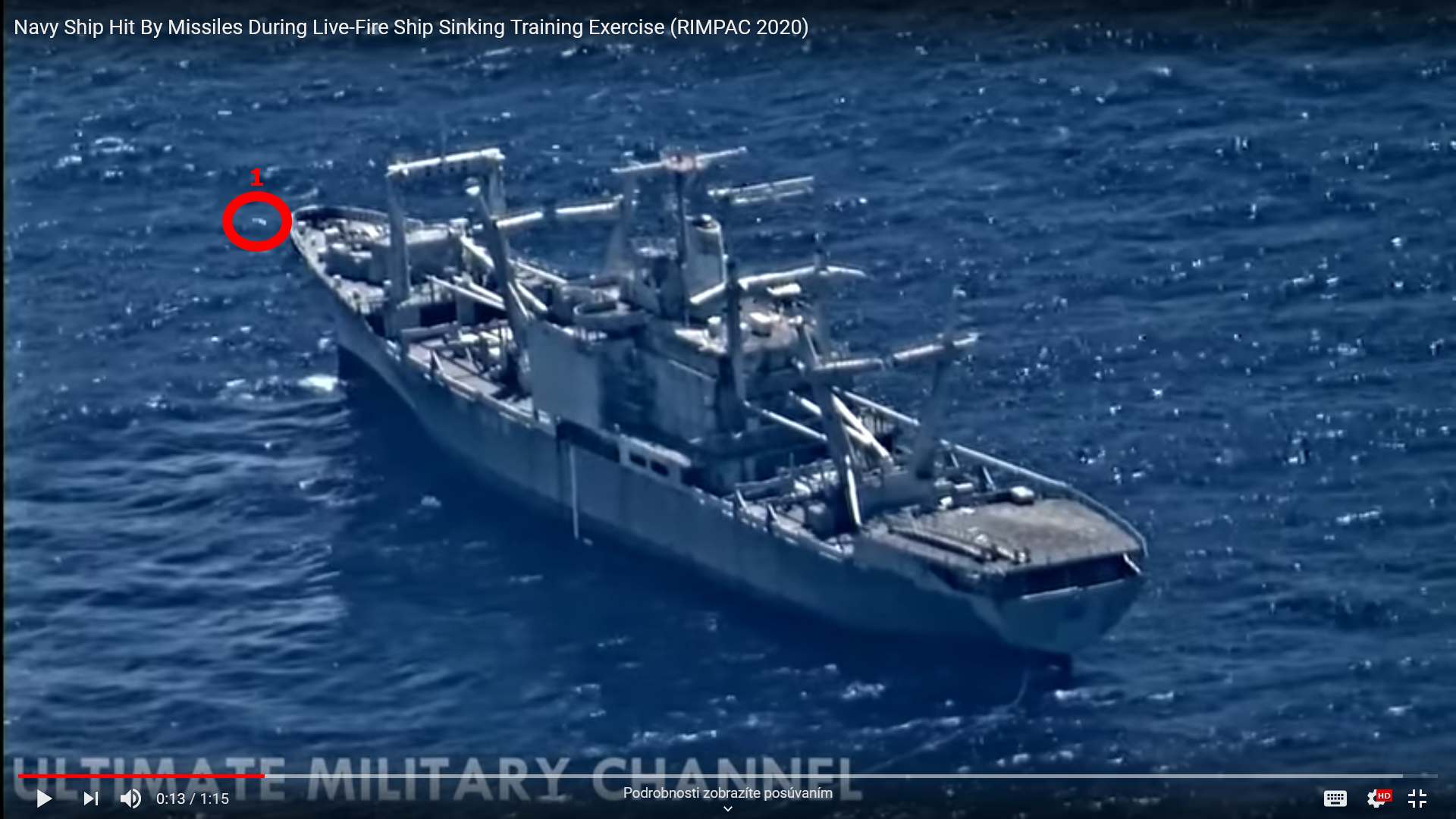 Tak to máš lepší oči. Já si (1) útočící na příď nevšiml. S tou 2 na levoboku je téměř perfektně synchronizovaná. "Viděl" jsem 4 útočící na levobok a v čase 22s jsem myslel, jak se zvedl ten plech na palubě, že to byla další střela na levoboku maskovaná kouřem.