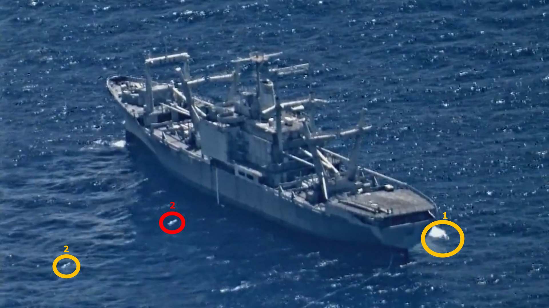 Plus "druhá" bola zrejme súčasne zo zásahom z opačnej strany - kúdol dymu na pravoboku vyrazí na dvoch miestach. "Prvá" (odpredu) podľa dlhej stopy vo vode zrejme cieľ nezasiahla.