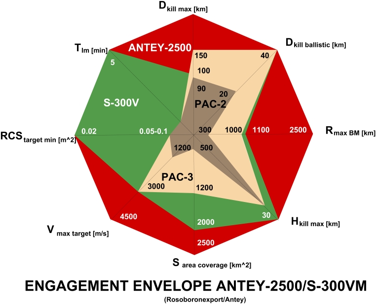 Tu porovnanie niektorých parametrov S-300V, Antej-2500 (exportná verzia S-300VM), Patriot PAC-2 a PAC-3