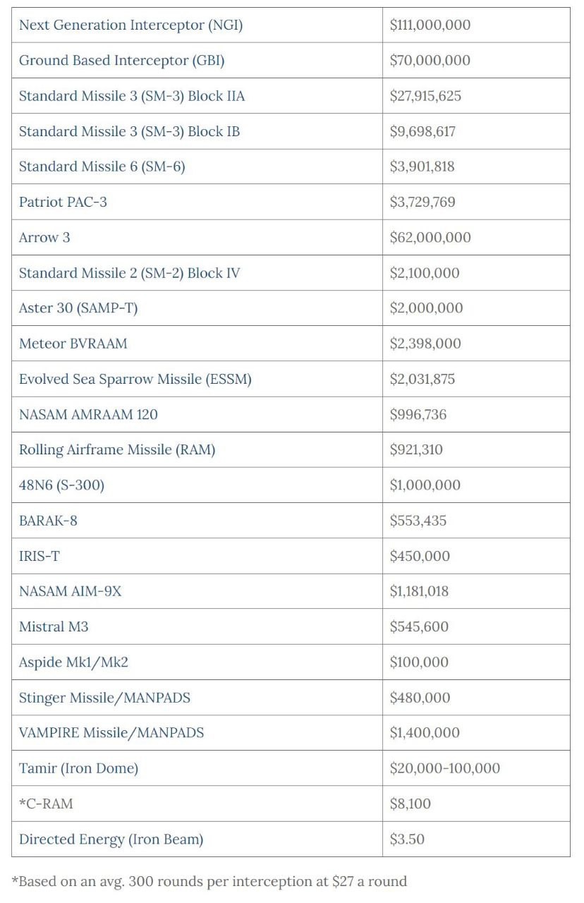 Porovnanie nákladov rôznych systémov protiraketovej (PRO) / protilietadlovej (PVO) obrany na jednu zachytenú raketu od neziskovej organizácie Missile Defence Advocacy Alliance, ktorá presadzuje rozvoj protiraketovej obrany pre Spojené štáty a ich spojencov.