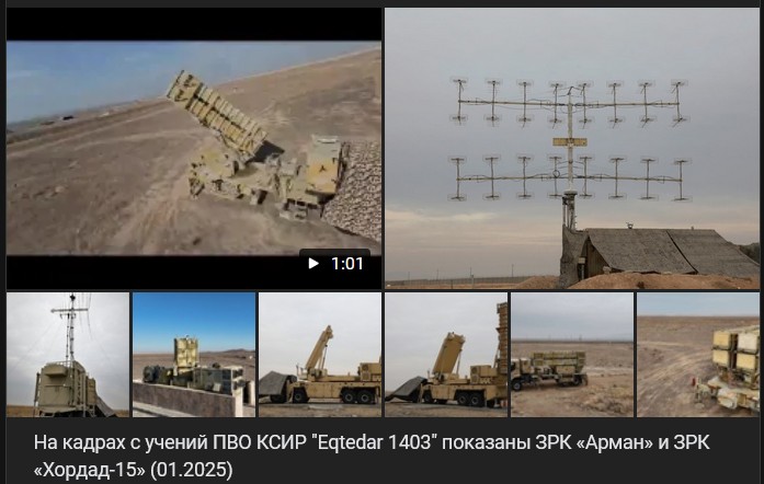 Zábery z cvičenia PVO IRGC "Eqtedar 1403" zobrazujú PVO systémy Arman a Khordad-15 (01/2025) Video https://vk.com/video-123538639_456314101 dĺžka 61 sek.