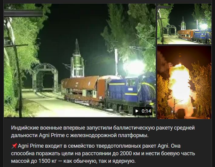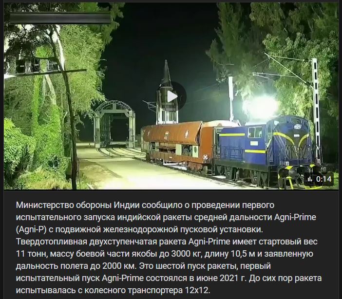 Video https://vk.com/video-173678697_456243956 dĺžka 14 sek.Ministerstvo obrany Indie zverejnilo vykonanie prvého skúšobného štartu indickej rakety stredného doletu Agni-Prime (Agni-P) zo železničného vagóna. 2-stupňová raketa Agni-Prime na tuhé palivo má štartovú hmotnosť 11 ton, hmotnosť bojovej časti asi až 3000 kg, dĺžku 10,5 m a deklarovaný dolet do 2000 km. Ide o 6. štart rakety, prvý skúšobný štart Agni-Prime sa uskutočnil v 06/2021. Doposiaľ bola raketa testovaná z kolesového podvozku 12x12.