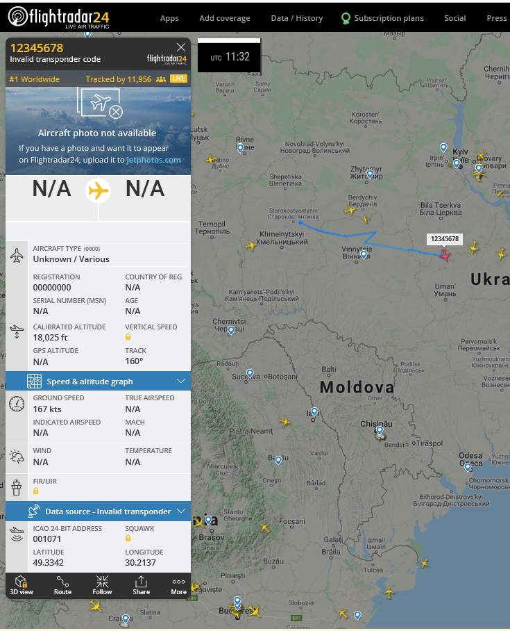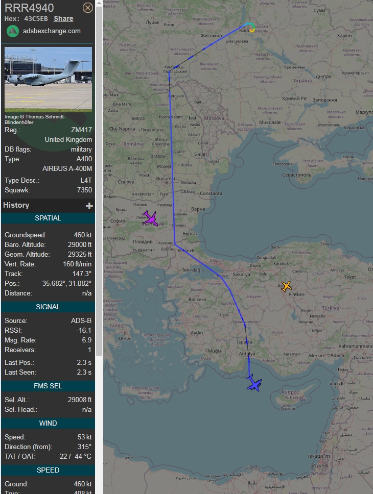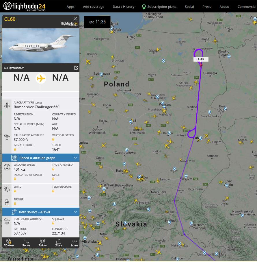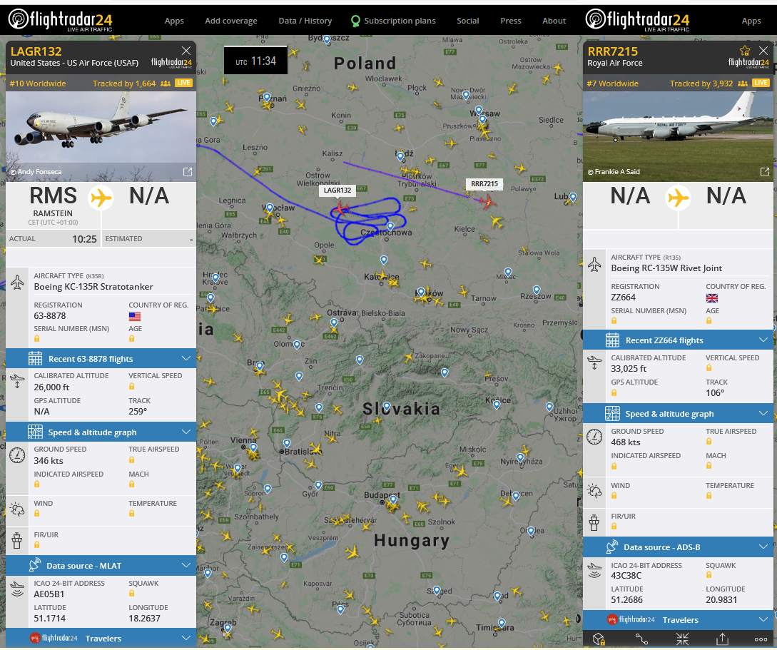 ukrajinské bezpilotné lietadlo? Americký tanker LARG132 nad Poľskom a špion z Británie letiaci do práce RRR7215 (ale pod Lublinom to neskôr zalomil na sever) Iný špion v práci - už tam poletuje aspoň hodinu