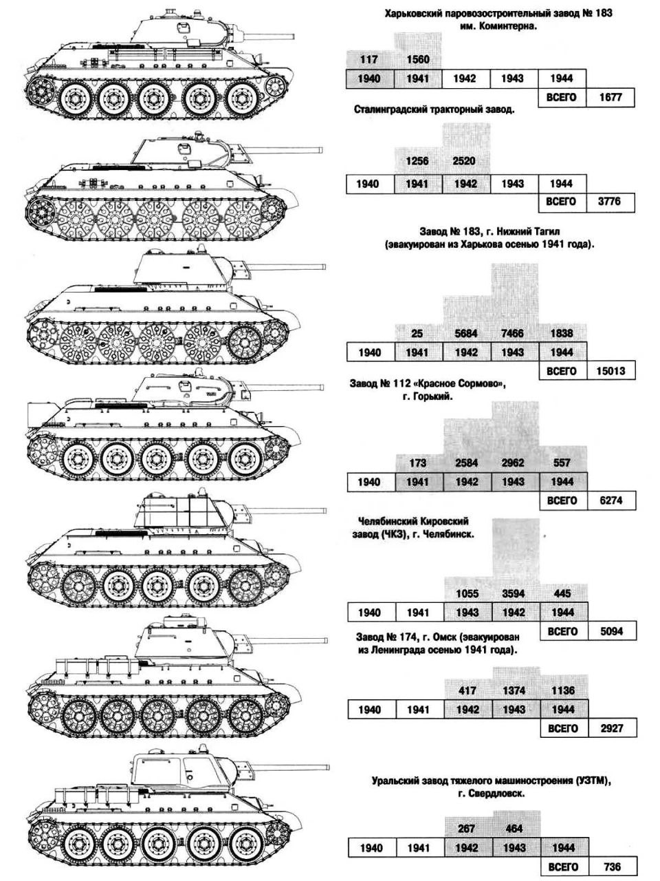 T-34-76 vyráběné v různých továrnách SSSR.