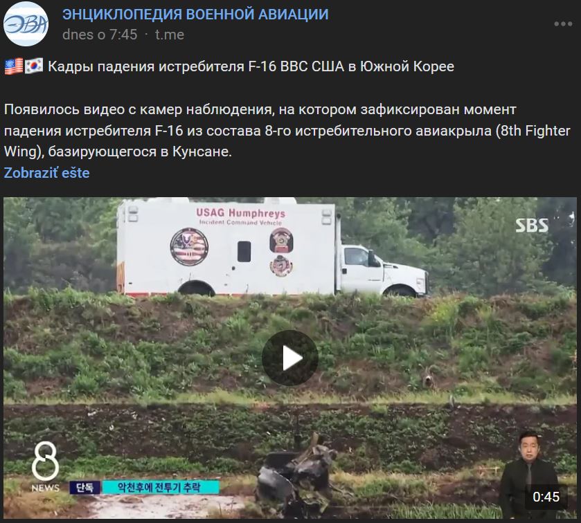 Video https://vk.com/video-173678697_456242717 dĺžka 45 sek. = všimnite si "uja" čo išiel k troskám na zemi = už sme sa tu o tom bavili čo za bordel tam je, to len ak by niekoho napadlo sa ísť pozrieť na kráter keď niekde padne lietadlo (napríklad naše budúce F-16)