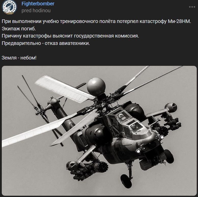 Počas cvičného letu (bez munície) havaroval Mi-28NM. Posádka zahynula. Príčinu nehody určí štátna komisia. Pravdepodobne - porucha stroja.