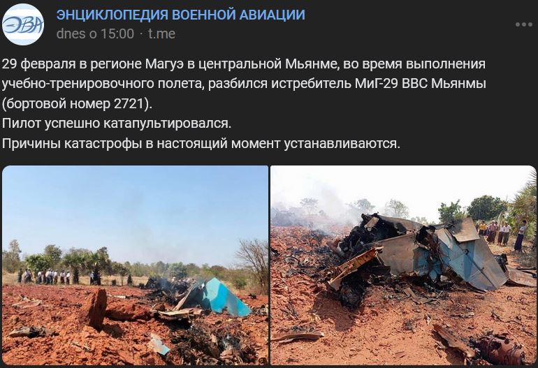 Štvrtok 29.02.2024 cca 12:45 hod. miestneho času, sa počas cvičného letu v regióne Mague v strednom Mjanmarsku zrútilo stíhacie lietadlo MiG-29 (МиГ-29), trupové číslo 2721 mjanmarských vzdušných síl. Pilot sa úspešne katapultoval. Príčiny havárie sa v súčasnosti zisťujú.