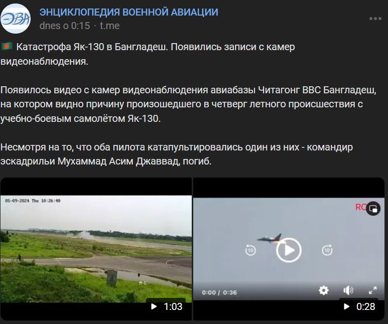 Video 1 https://vk.com/video-173678697_456243319 dĺžka 1:03 min.Objavili sa zábery z priemyselnej kamery na leteckej základni Bangladéša v Čitagong, ktoré ukazujú príčinu štvrtkovej leteckej nehody cvično-bojového lietadla Jak-130 (Як-130). Hoci sa obaja piloti katapultovali, jeden z nich, veliteľ letky Muhammad Asim Jawwad (Osim Zaiyad), zahynul.