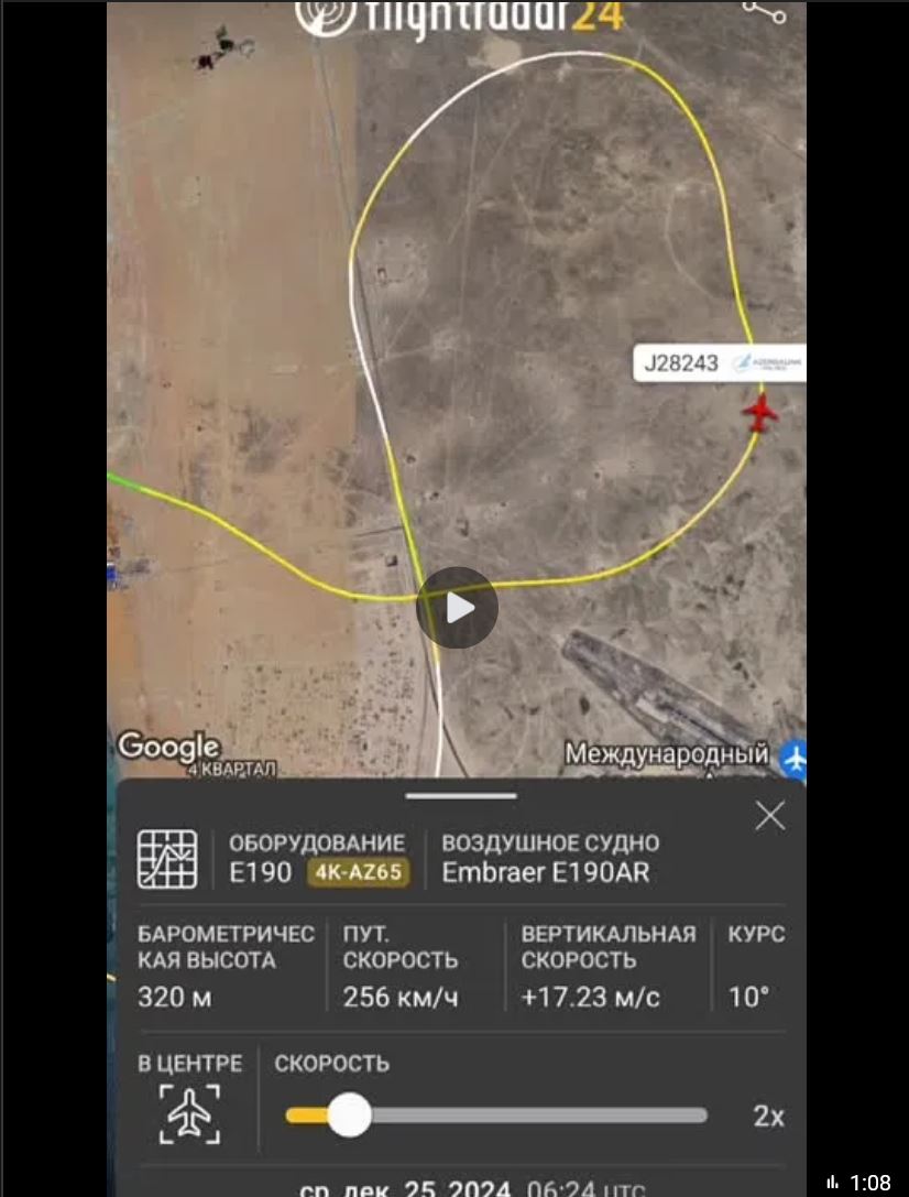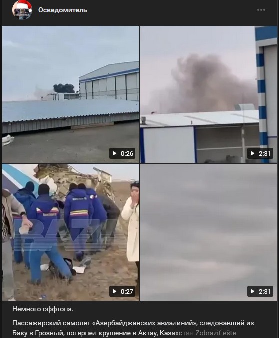 Osobné lietadlo spoločnosti Azerbajdžanských aerolínií, ktoré letelo z Baku do Grozného havarovalo v kazašskom meste Aktau (Актау = letisko pri meste tu). UPD : Haváriu lietadla pri Aktau prežilo 28 ľudí, z toho 2 deti, uviedlo kazašské ministerstvo pre mimoriadne situácie. Video 1 https://vk.com/video-123538639_456313715 dĺžka 26 sek. (samotný pád)