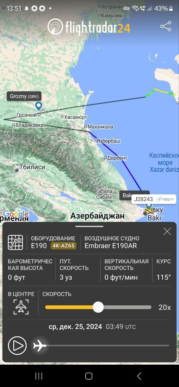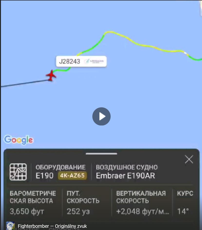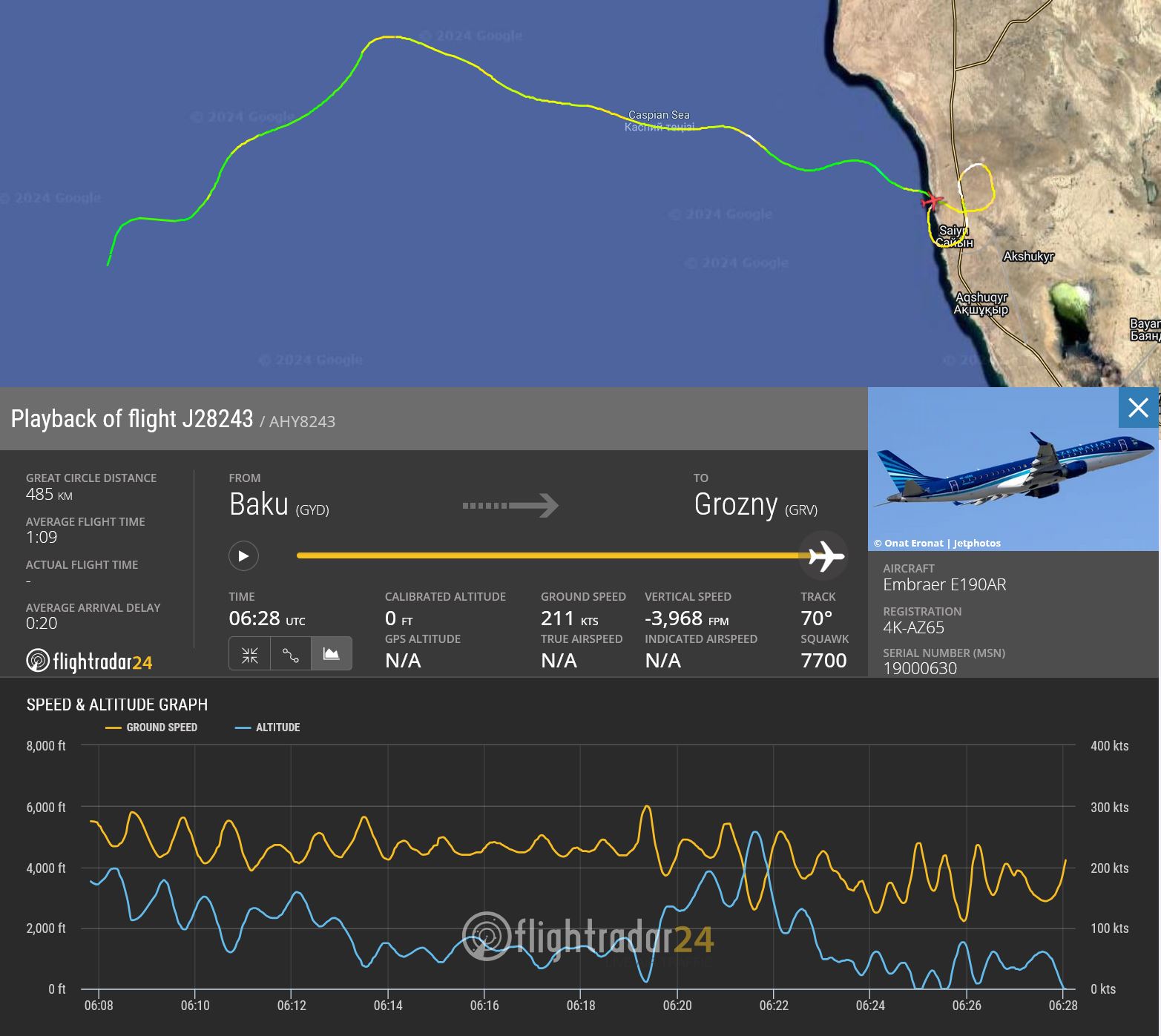 Streda 25.12.2024 o cca 06:28 hod. UTC (2:33 hod. od štartu). Lietadlo Embraer ERJ-190AR patriace Azerbaijan Airlines, registrácia 4K-AZ65 vyrobené 2013 s motormi General Electric CF34-10E. Let J28243, na palube 5 členov posádky + 67 cestujúcich, štart Baku o 03:55 UTC, o 06:07 UTC už na Kaspickým morom hlásenie 7700 (núdzový stav) = 2:12 hod. od štartu. Od vyhlásenia núdzového stavu do pádu 21 min.