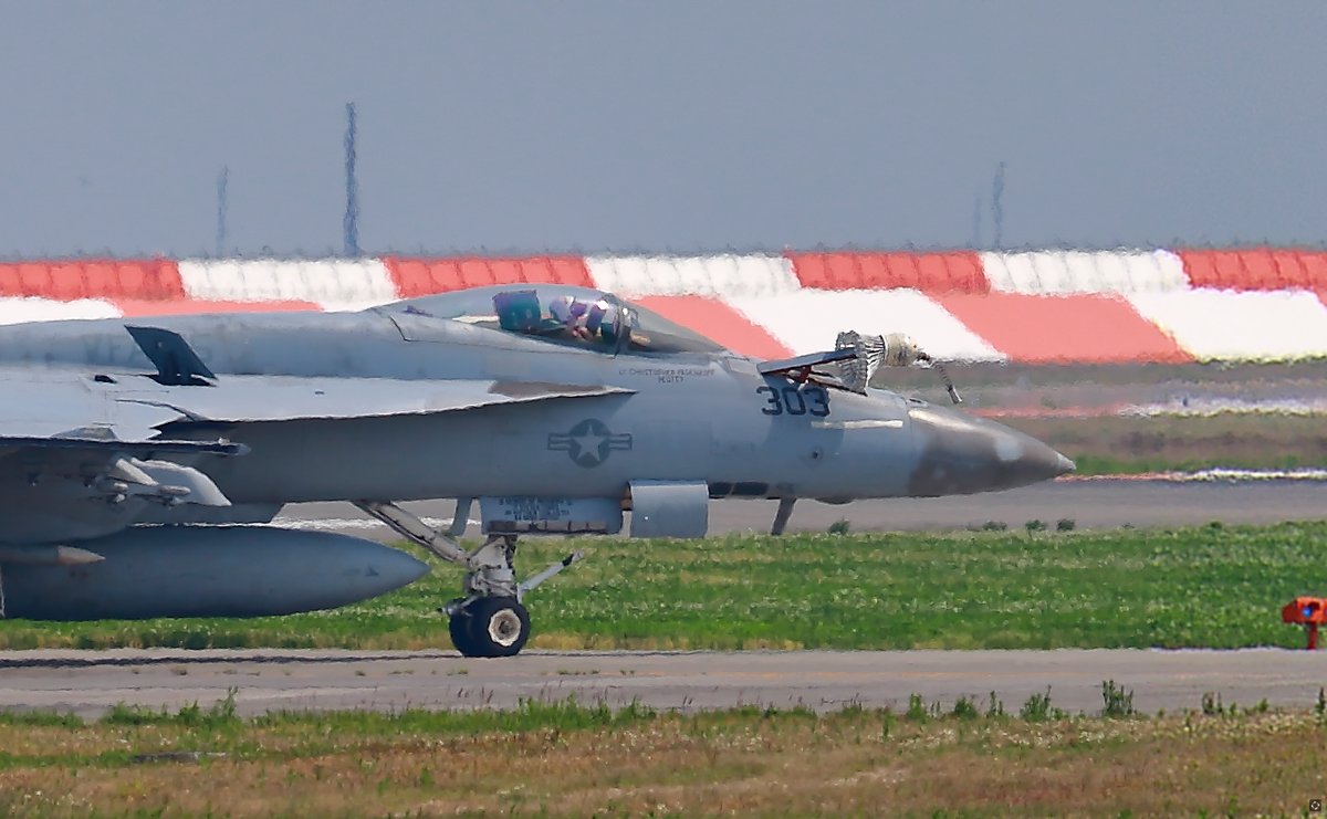 Streda 02.05.2018 Japonsko, lietadlo US NAVY typu F/A-18E pristátie na letisku po vzdušnom tankovaní kde sa utrhol celý tankovací kôš: