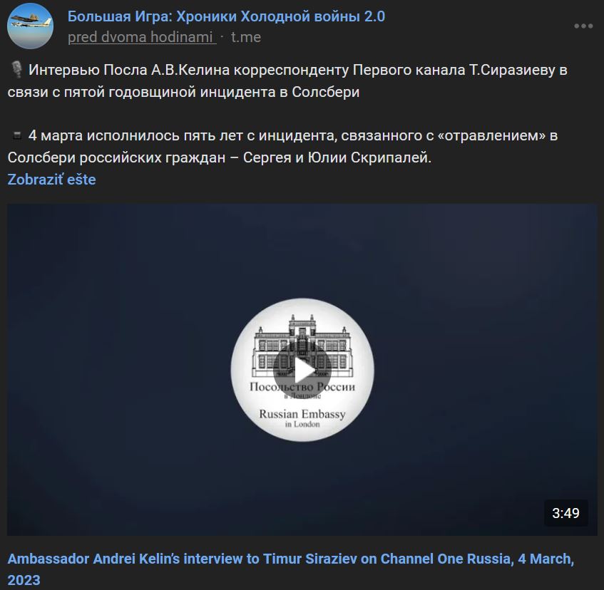Rozhovor veľvyslanca A.V.Kelina (А.В.Келина) s korešpondentom Prvého kanála T. Sirazijevu (Т.Сиразиеву) pri príležitosti 5. výročia incidentu v Salisbury