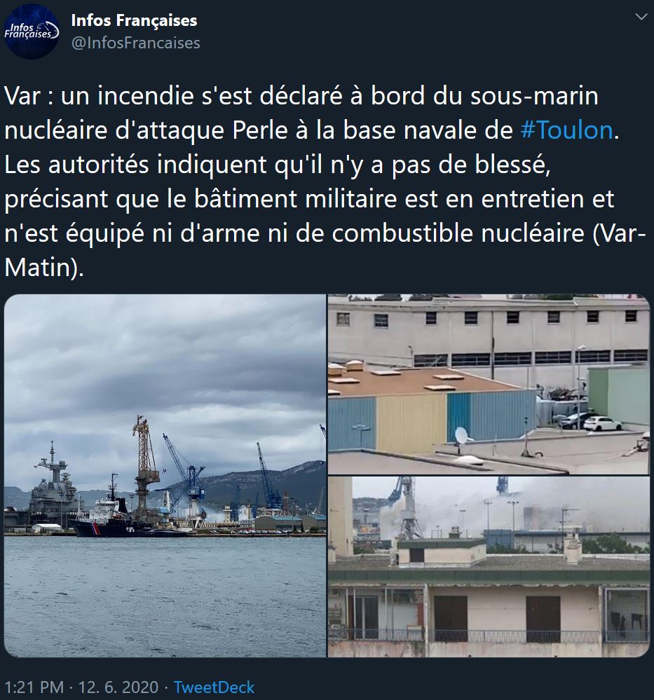 V piatok 12.06.2020 o 10:35 hod. miestneho času vznikol požiar v A-ponorke "Perle" S606, mesto Toulon, Francúzko: