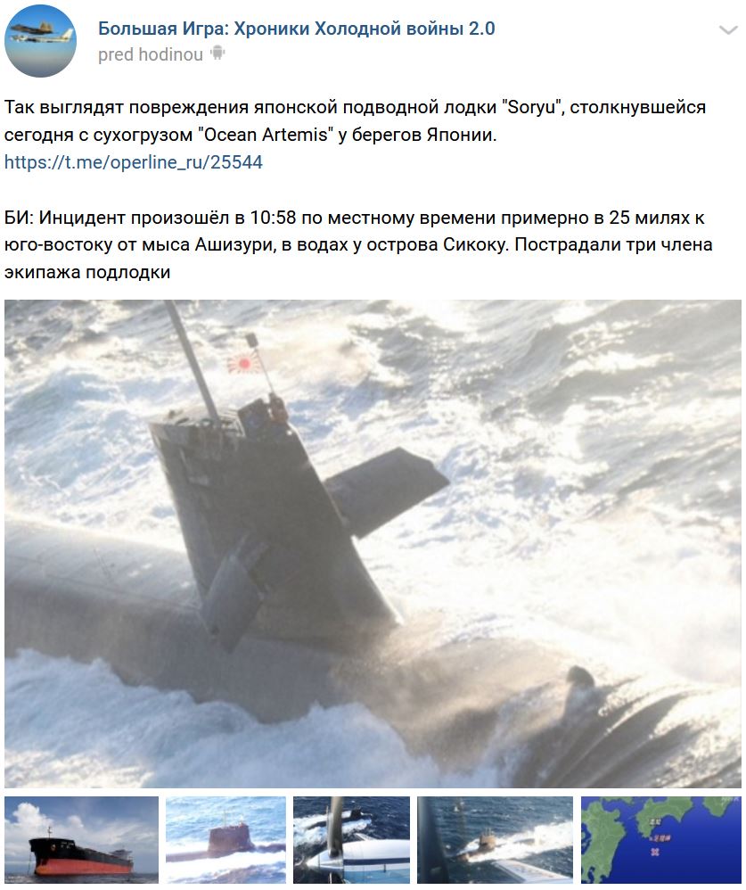https://www.novinky.cz/zahranicni/svet/ ... i-40350338Ponorka japonského vojenského námořnictva a hongkongská obchodní loď se v pondělí srazily u jižní části japonského pobřeží. Při střetu byli lehce zraněni tři námořníci z ponorky a náraz poškodil její věž, uvedla agentura AP s odvoláním na japonské ministerstvo obrany.