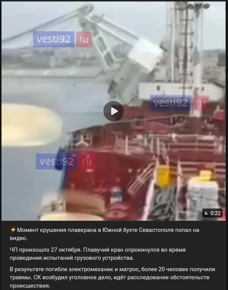 Video https://vk.com/video-104764077_456289668 dĺžka 22 sek.Moment havárie plávajúceho žeriavu v Južnej zátoke Sevastopoľu bol zaznamenaný na videu.
