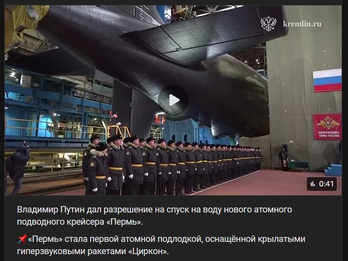 Vladimir Putin (Владимир Путин) požehnal spustenie na vodu nového ponorkového krížnika "Perm" (Пермь) s jadrovým pohonom. „Perm“ sa stal prvou ponorkou na jadrový pohon vybavenou hypersonickými raketami Cirkon (Циркон).
