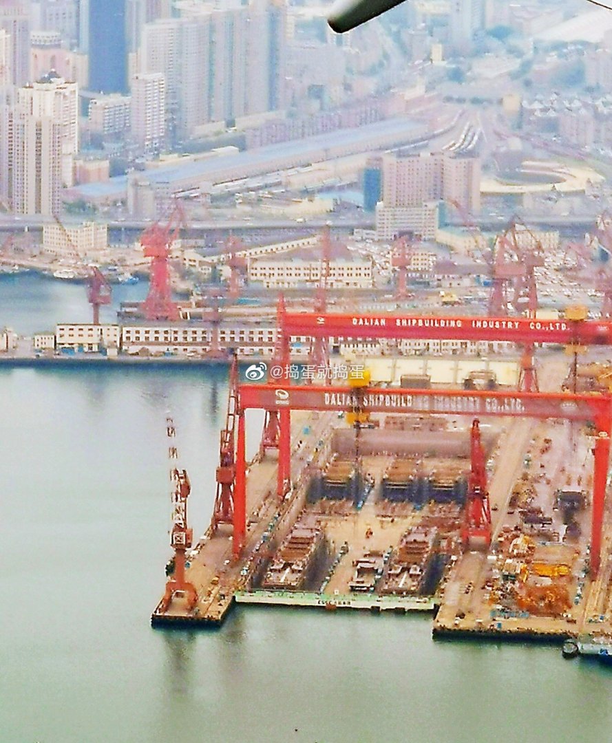 3. čínska lietadlová loď vo výstavbe v lodeniciach Hudong-Žonghua v Šanghaji má na strechách, ktoré zakrývajú namontované elektromagnetické katapulty, nápisy. Preklad: "Realizovať plány strany na posilnenie ozbrojených síl v novej ére a premeniť Ľudovú oslobodzovaciu armádu na armádu svetovej úrovne. Usilujte sa o vybudovanie silného a moderného námorníctva a poskytnite silnú podporu pri realizácii sna čínskeho ľudu o silnej armáde."