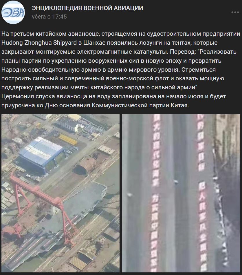 Slávnostné spustenie 3. lietadlovej lode na vodu je naplánované na začiatok 07/2022 a bude sa konať v Deň založenia Komunistickej strany Číny. Zdroj https://t.me/ChDambiev/17622 + https://vk.com/wall-173678697_269441 z 15.06.2022 + lepšie foto