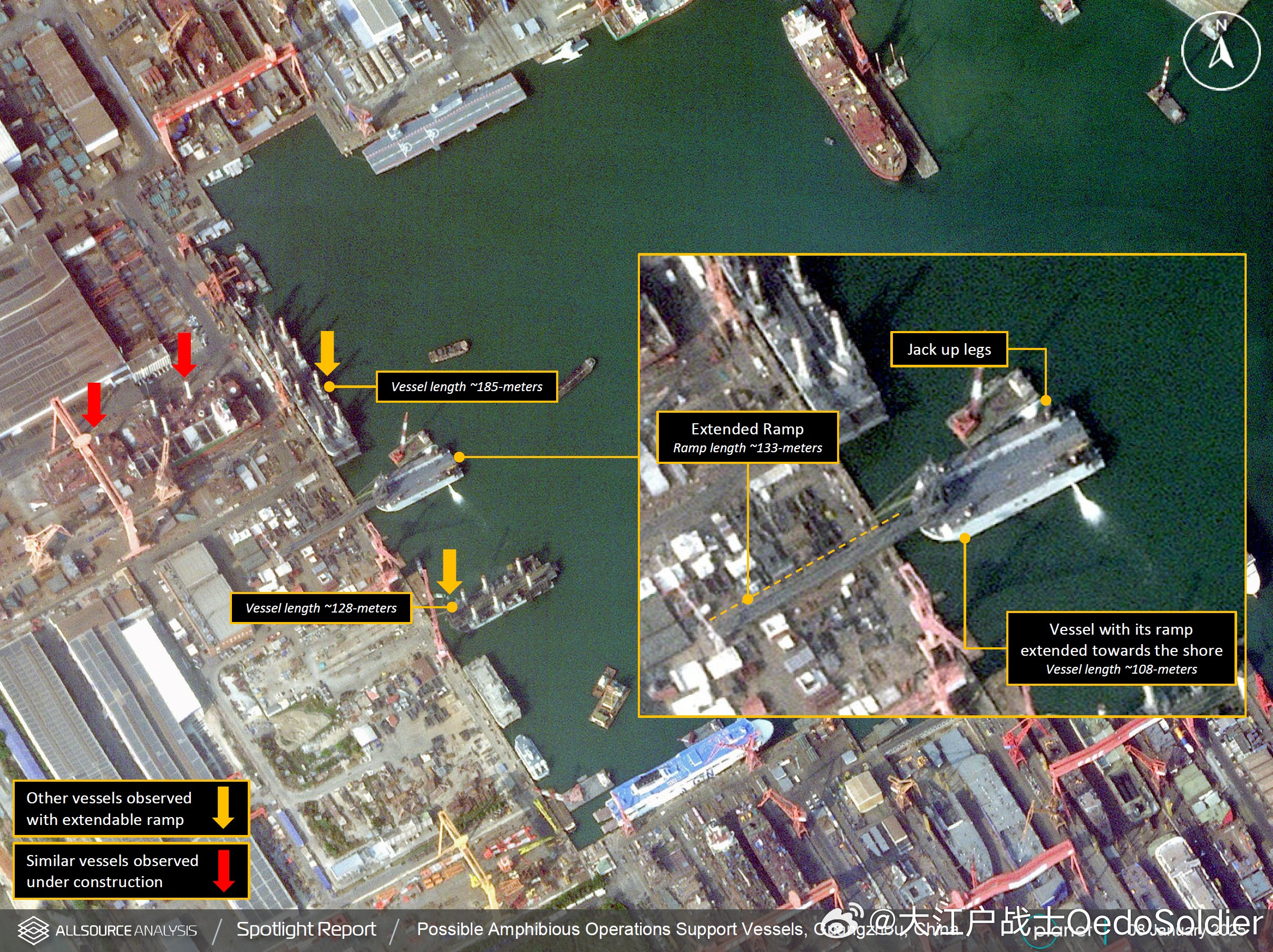 V lodeniciach v Guangzhou na juhu Číny spozorovali niekoľko zvláštnych a neobvyklých člnov, najmenej 3, ale pravdepodobne 5 alebo viac. Tieto lode majú nezvyčajne dlhé cestné mosty vychádzajúce z ich príďových častí. Vďaka tejto konfigurácii sú obzvlášť dôležité pre prípadné budúce vylodenie síl ČĽR (Čínskej ľudovej republiky) na taiwanských ostrovoch.