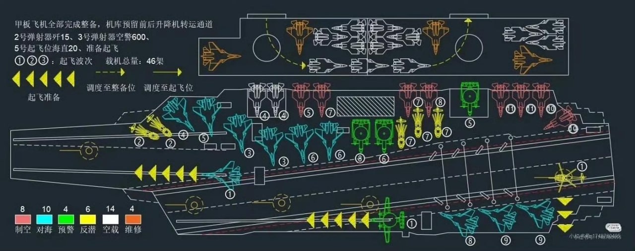 Zdroj https://vk.com/wall-123538639_4711160 z 08.10.2025Plán rozloženia palubnej leteckej techniky na čínskych lietadlových lodiach projektu „Fujian“.