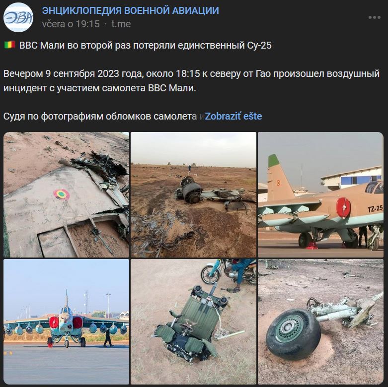 V sobotu 09.09.2023 približne o 18:15 hod. miestneho času severne od Gao, došlo k leteckému incidentu s lietadlom VVS Mali. Súdiac podľa fotografií trosiek lietadla a katapultovacieho sedadla K-36DM (К-36ДМ) (chyba autora, na fotografii č. 5 je katapultovacie sedadlo K-36L (К-36Л), nie K-36DM (К-36ДМ), čo je jasne vidieť na absencii opierky rúk a deflektora chrániaceho hlavu a hrudník pilota pri katapultovaní nadzvukovou rýchlosťou, pozn. redakcie), havaroval jediný Suchoj Su-25 (Су-25) VVS Mali (trupové označenie TZ-25C). Pravdepodobne bol šturmovik poškodený paľbou zo zeme zo strany síl "Координационного движения Азавад"/"Mouvement Coordination Azawad" (CMA) po nálete v oblasti Almustrat. Pri pokuse doletieť na letisko Gao sa lietadlo zrútilo v hornatej oblasti asi 10 km západne od Ifardanu. Lietadlo rodiny Suchoj Su-25 (Су-25) dostala vláda Mali v 01/2023. V 10/2022 havaroval aj (v tom čase) jediný malijský Suchoj Su-25 (Су-25) s trupovým označením TZ-20C.