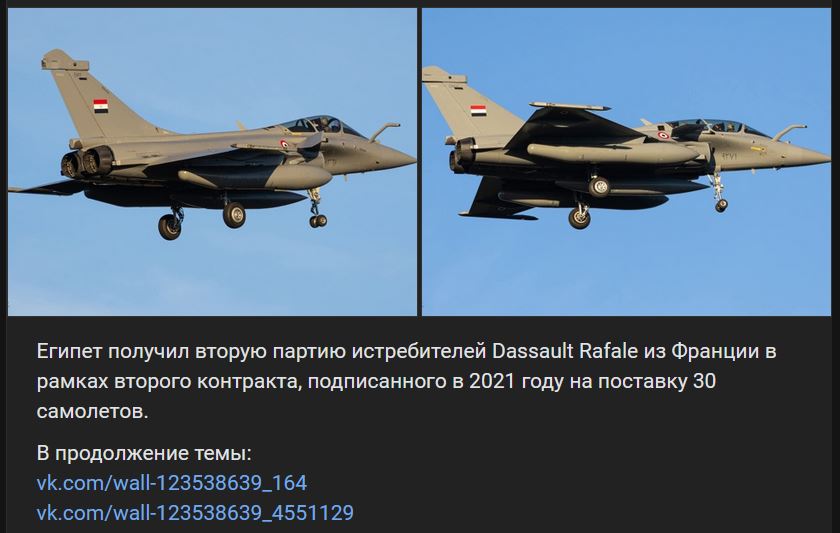 Zdroj https://vk.com/wall-123538639_4712895 z 10.10.2025Egypt dostal 2. dodávku lietadiel rodiny Dassault Rafale z Francúzska v rámci 2. kontraktu, ktorý bol podpísaný v roku 2021 na dodávku 30 lietadiel.