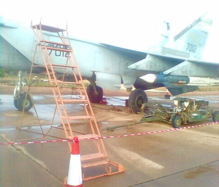 "Líbyjský MiG-25PD(S) registrácia '7012' bola uvedená do prevádzky na leteckej základni Misrata, vidieť podvesené rakety kategórie vzduch-vzduch typu R-40TD (teplo) a R-40RD (radar) dlhého dosahu."ALL HAIL THE MIGHTY FOXBAT! Libyan MiG-25PD(S) '7012' has been brought back into service at Misrata airbase, seen here armed with R-40TD and R-40RD long range air-to-air missiles.