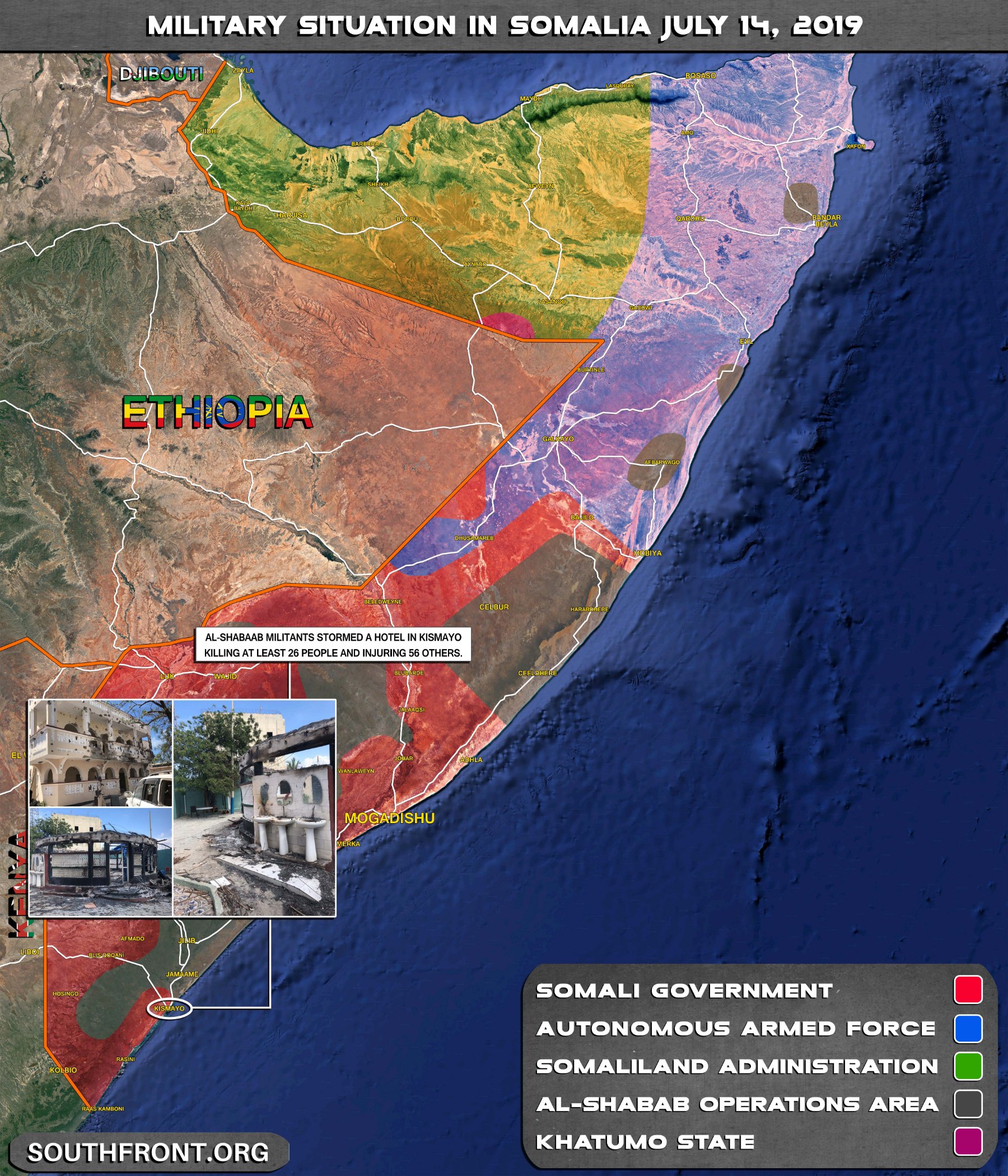 Nejméně 26 lidí, včetně prominentního novináře a několika cizinců bylo zabito a dalších 56 bylo zraněno při útoku na hotel Asasey v přístavu Kismayo v jižním Somálsku. Incident trval od 12. do 13. července. Místní síly potřebovaly více než 12 hodin k likvidaci ozbrojenců a obnově kontroly nad oblastí.