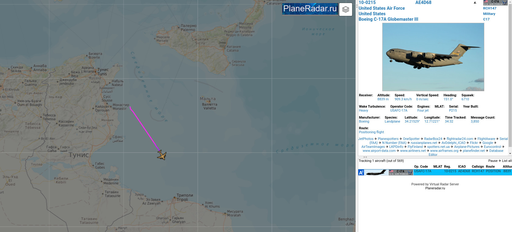 Toto je zajímavé: Včera letěl USAF C-17A z Ramsteinu pravděpodobně do Tripolisu/Misuraty