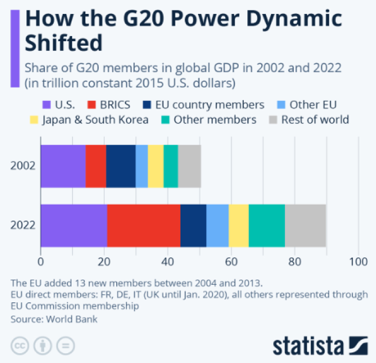 V roce 2022 měl blok BRICS o něco vyšší společný HDP – i v nominálním vyjádření – než USA, a to 30 %, resp. 27 % HDP skupiny G20 očištěného o inflaci. Země EU Německo, Francie a Itálie jsou přímými členy G20 a dohromady tvoří dalších 10,7 %. Při započtení všech členů EU se tento podíl zvyšuje na přibližně 20 %. Zbývající členové EU jsou však ve skupině G20 zastoupeni pouze dvěma vysoce postavenými delegáty, a to předsedy Evropské komise a Evropské rady.