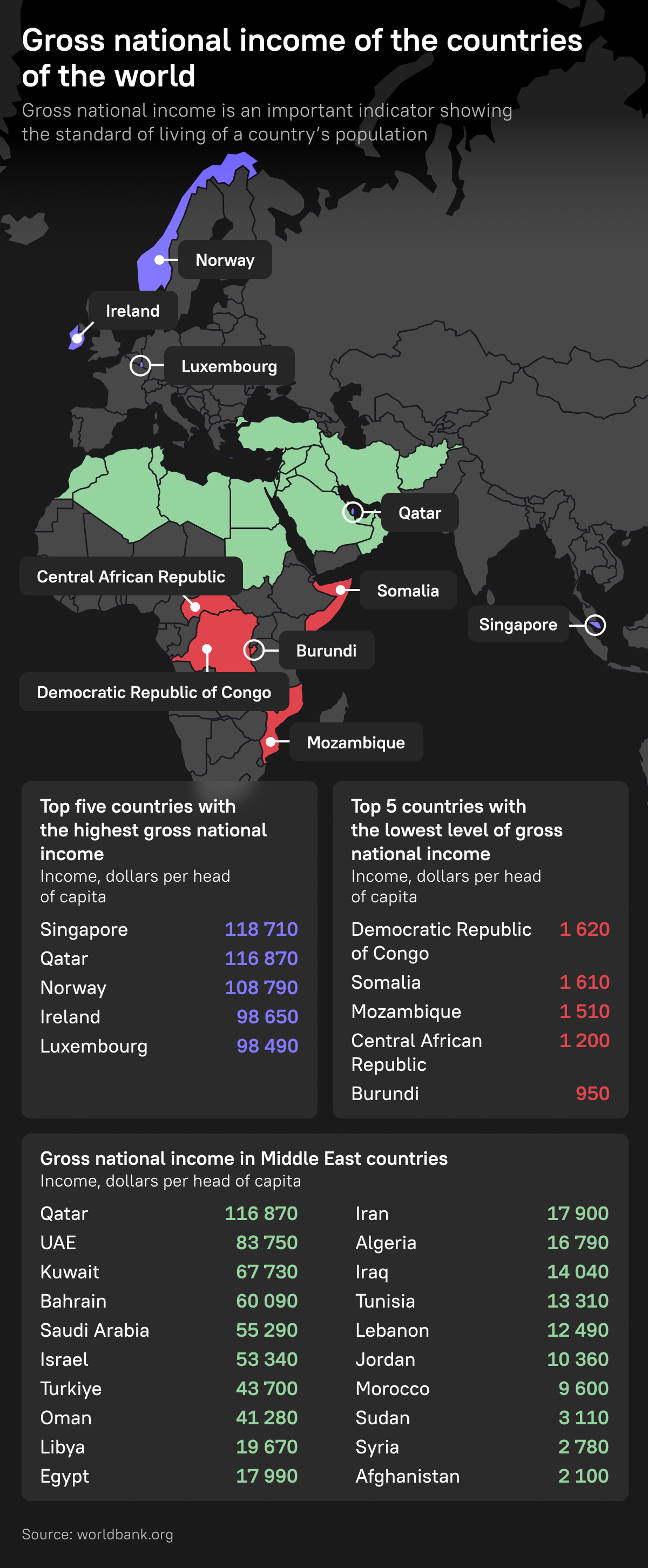 Podľa Svetovej banky patrí medzi päť krajín s najvyšším hrubým národným dôchodkom na obyvateľa: Singapur (118 710 USD), Katar (116 870 USD), Nórsko (108 790 USD), Írsko (98 650 USD) a Luxembursko (98 490 USD).