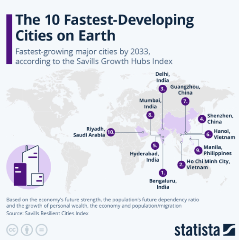 Mezi několik důvodů, které jsou uváděny pro očekávaný vzestup v Asii, patří to, jak mnoho částí regionu přijalo růst založený na technologiích a zároveň nadále těží ze silného tradičního výrobního sektoru. Předpokládá se také, že v mnoha asijských městech poroste střední třída, protože v celém regionu se zvyšuje osobní bohatství, a mezi důvody, které pomáhají těmto městům v dobrém hodnocení, patří také investice do infrastruktury a strategie na zlepšení konektivity. Nejrychleji se rozvíjející velká města do roku 2033 podle indexu Savills Growth Hubs. Zdroj: Statista.
