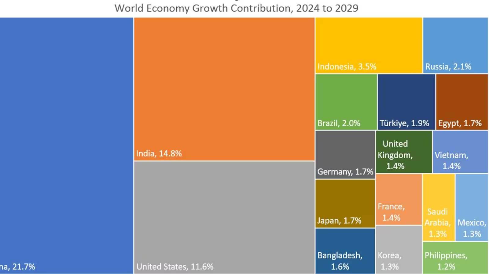 Čína bude v příštích pěti letech největším přispěvatelem ke globálnímu růstu, přičemž její podíl bude o 22 % větší než všechny země G-7 dohromady, podle propočtů agentury Bloomberg s použitím nových prognóz MMF. Indie je dalším globálním růstovým molochem, od kterého se očekává, že do roku 2029 přidá téměř 15 % z celkového počtu.