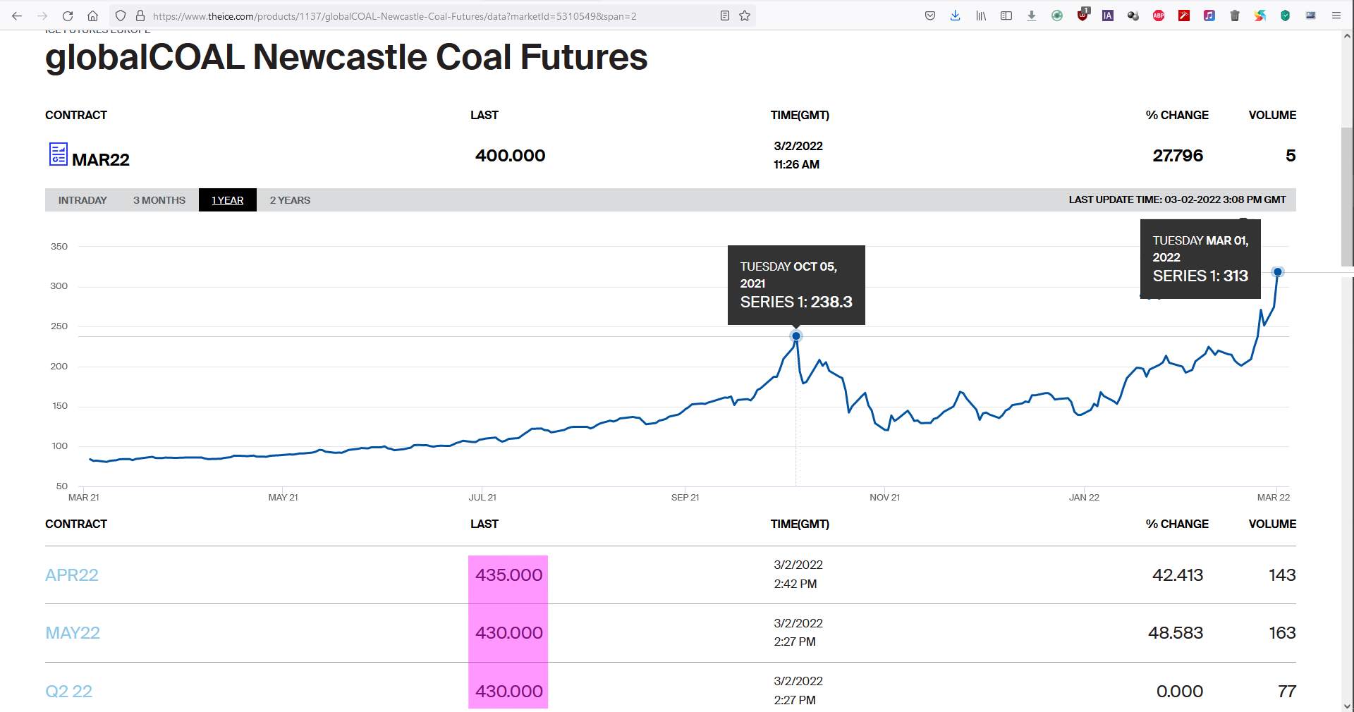 :sipka: ročný vývoj ceny energetického uhlia na ICE (jednotka je 1000 metrických ton?)