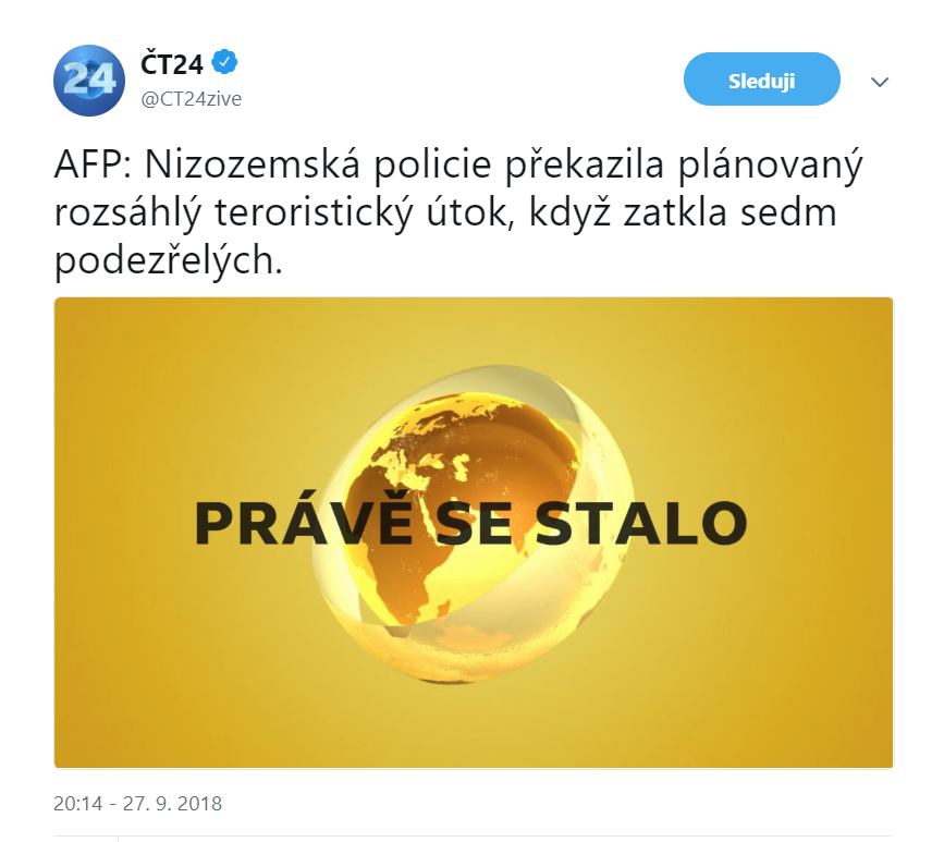 https://twitter.com/CT24zive/status/1045376217954889728https://ct24.ceskatelevize.cz/svet/2607 ... ejnou-akciNizozemská policie odhalila spiknutí, jehož cílem měl být útok na akci velkého rozsahu, při níž by byla pravděpodobnost, že přijde o život značné množství civilistů. Policie proto zatkla na čtyřech různých místech celkem sedm mužů ve věku od 21 do 34 let. Pro svůj útok chtěli použít vesty s výbušninami, automatické zbraně a nálož v automobilu, napsala agentura AP.