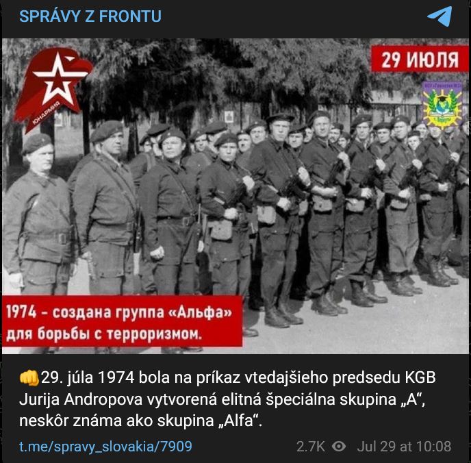 29.07.1974 =pred 50-timi rokmi bola na príkaz vtedajšieho predsedu KGB Jurija Andropova vytvorená elitná špeciálna skupina „A“, neskôr známa ako skupina „Alfa“.