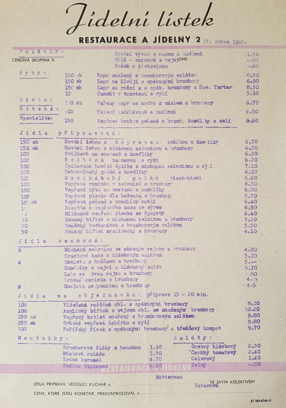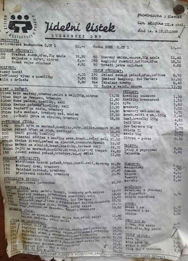 Dlužno dodat,že v roce 1986 jsem měl nástupní plat 1 500Kč.(výplatní pásku mám schovanou)To potom ty ceny v restauraci vypadají poněkud jinak.