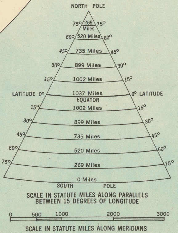 Za povšimnutie stojí, že vzdialenosti medzi cca 65° s.š. a cca 15°s.š. nie sú nejak výrazne skreslené (modrá čiara vymedzuje vzdialenosť odhadom 269 míľ)