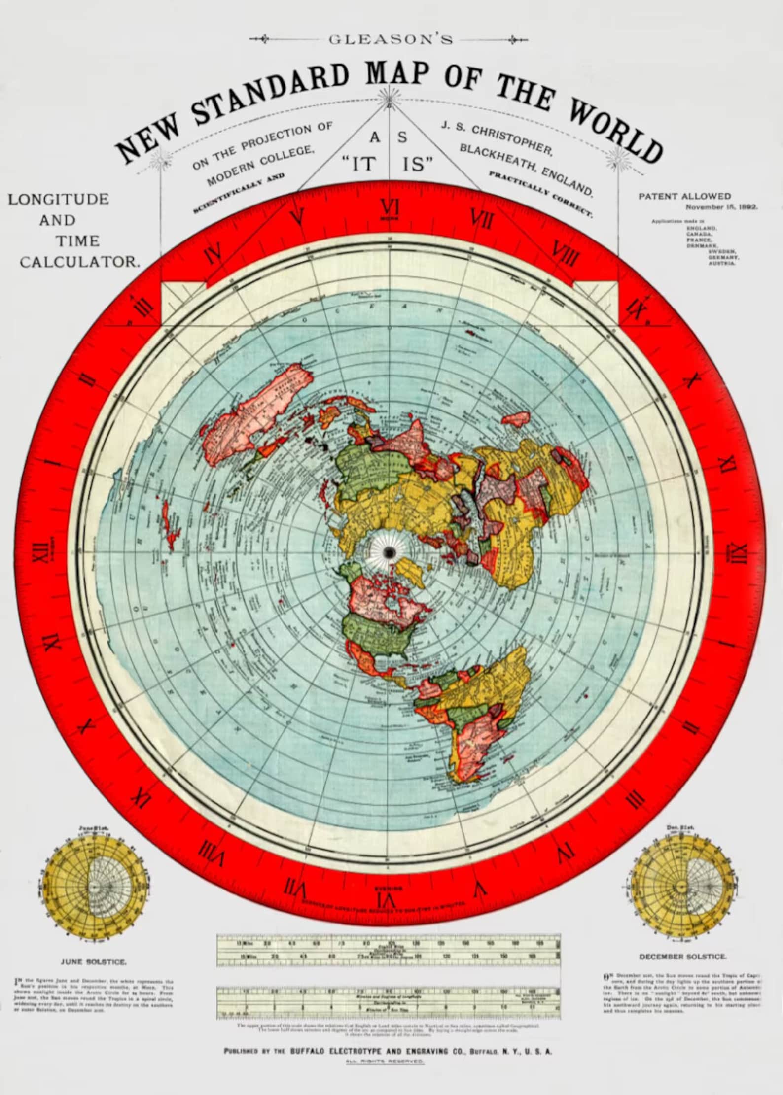 Na mape s červeným prestencom ("kalkulátor") je horná mierka prevod britských a námorných míľ a dolná "mierka" je prevod zemepisných stupňov na časové hodiny a minúty.