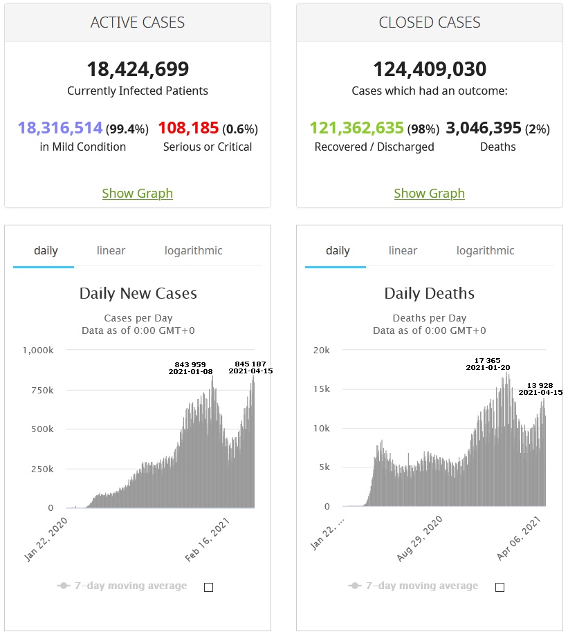 India rastie - +294 290 nových prípadov k 20.4.2021. Denný rekord zatiaľ držia USA - 307 581 nových prípadov 8.1.2021.