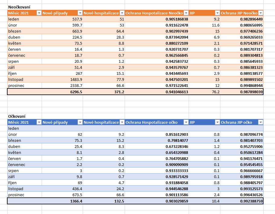 A porovnaní diagnostikovaných a hospitalizovaných zjistíte, že neočkovaní jsou chránění proti hospitalizací z 94% a proti JIP až z 98%