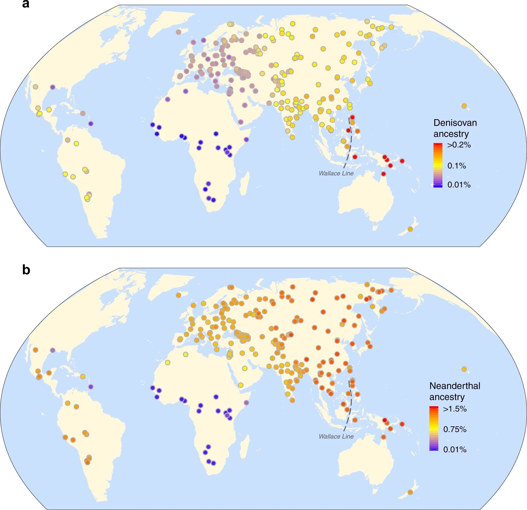 Priemerné podiely denisovanskej a neandertálskej introgresie u moderných ľudí.