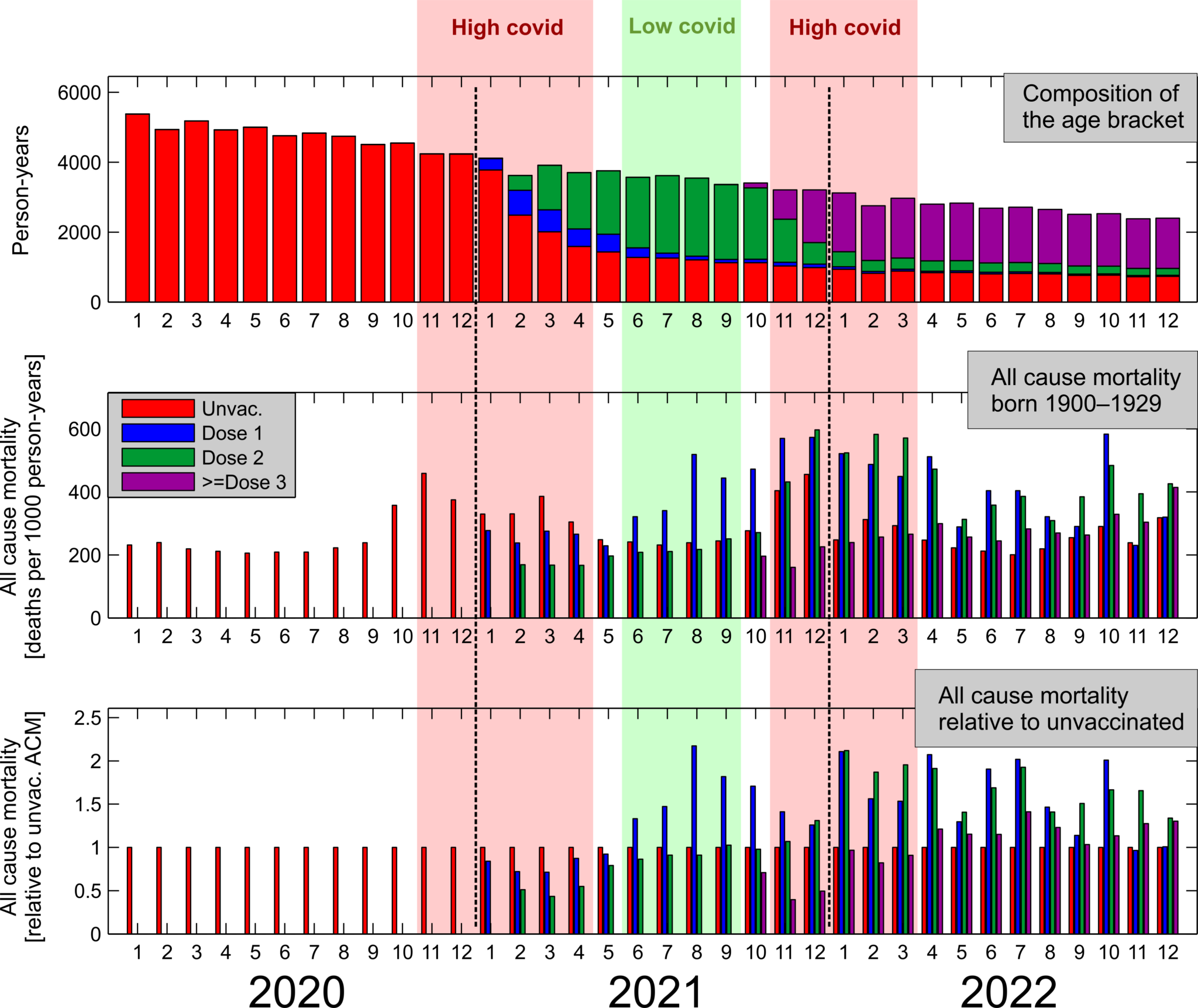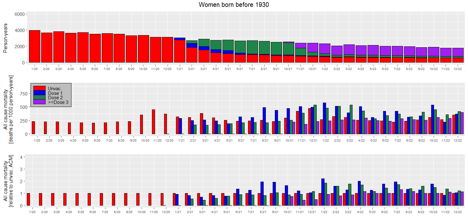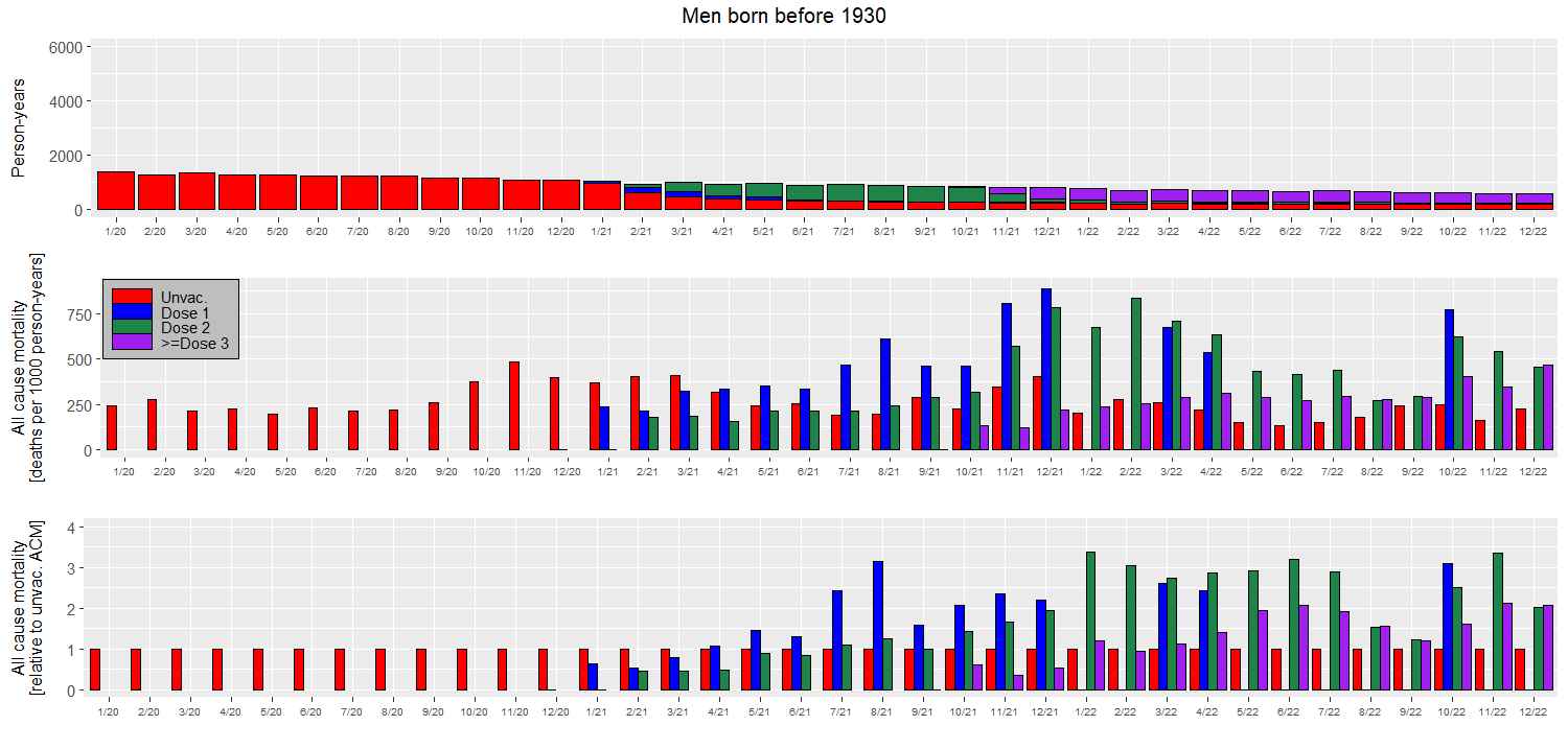 Prostřední panel je ten nejdůležitější. Ukazuje celkovou mortalitu lidí narozených před rokem 1930 v jednotlivých měsících dle jejich vakcinačního statutu. Kategorie, kde bylo daný měsíc méně než 5 úmrtí, nejsou zobrazeny. Spodní panel obsahuje stejnou informaci jako prostřední, jen je mortalita vztažena k mortalitě neočkovaných pro jednodušší vizuální srovnání. Mortalita očkovaných v daném měsíci je ve spodním panelu jednoduše vydělena mortalitou neočkovaných v tom samém měsíci, všechny červené sloupečky na spodním panelu mají tedy velikost rovnou jedné. Chytřejší kolegové mi říkali, že červené sloupečky ve spodním panelu nenesou žádnou informaci a že je mám odstranit. Mají pravdu, ale já jsem je tam nechal.