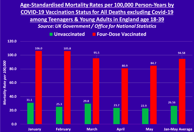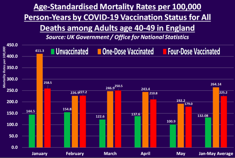 Zajímavé ovšem je, že od podzimní vlny covidu 2021 až do konce roku 2022 umírali očkovaní první i druhou dávkou podstatně více než neočkovaní. Mortalita očkovaných třetí (a vyšší) dávkou opět vždy začíná na nižších číslech než mortalita těch s předchozí dávkou (zřejmě opět HVE), ale ke konci období již byla systematicky vyšší než mortalita neočkovaných. Toto pozorování se nedá úplně jednoduše skloubit s oficiální covidovou story o tom, jak vakcíny zachraňovaly životy.